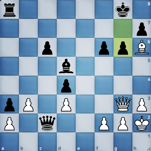 Les noirs ont joué g6. Trait aux blancs. Les blancs ont une tour en moins. Autant de pions de chaque côté.